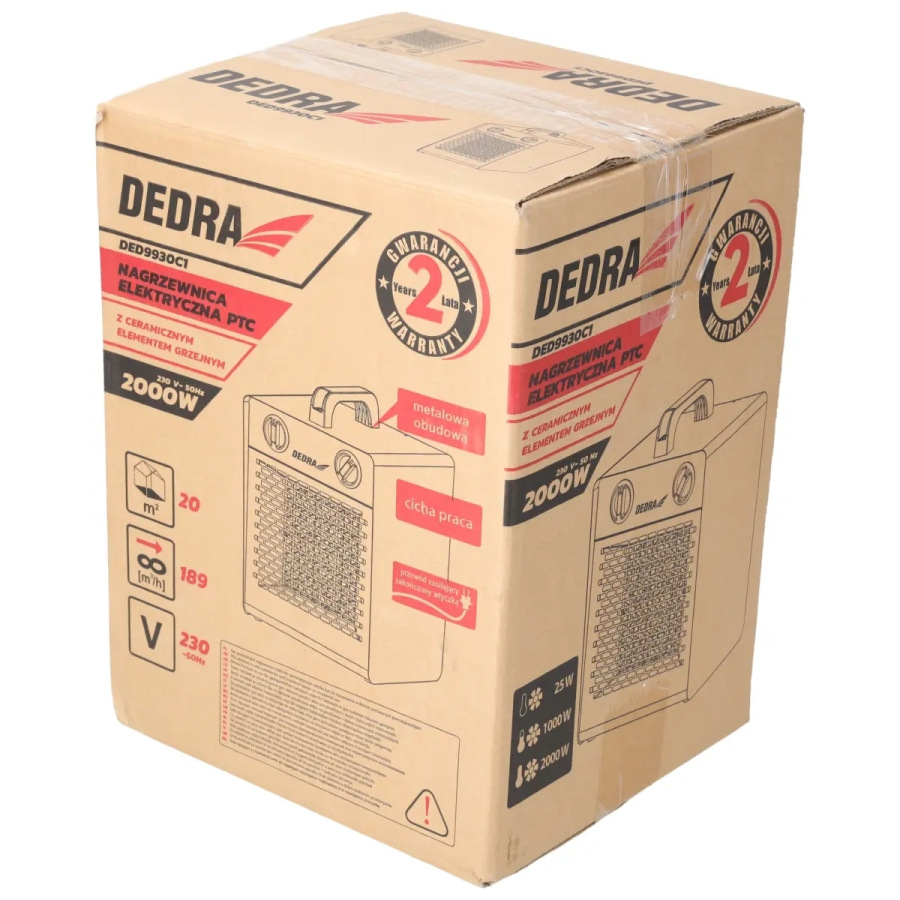 Výkon: 1000 W/2000 W; prietok vzduchu 148 m³/h; výstup 230 V; keramické vykurovacie teleso; ochrana proti prehriatiu; termostat; 3 prevádzkové režimy: chladný/teplý/horúci