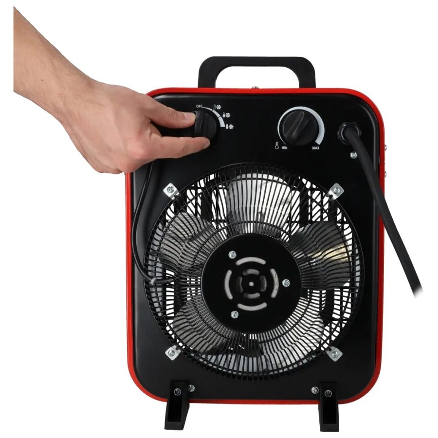 Výkon: 2500 W/5000 W; prietok vzduchu 730 m3/h; 3-fázová zásuvka 400 V; ochrana proti prehriatiu; termostat; 3 prevádzkové režimy: chladný/teplý/horúci