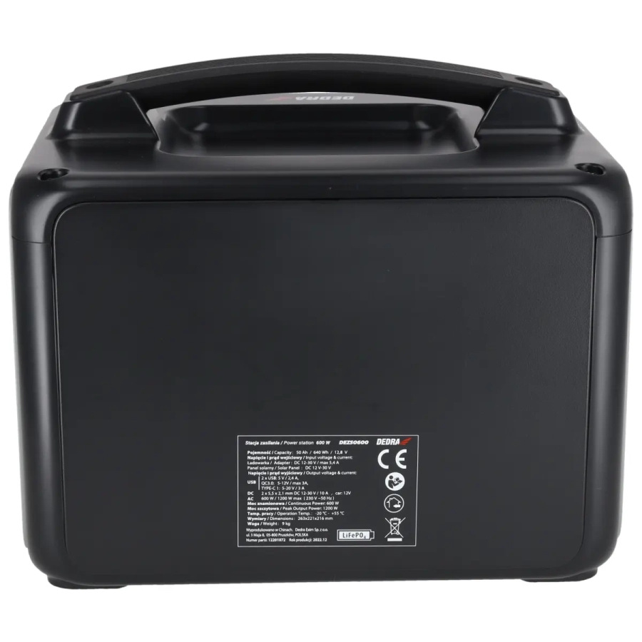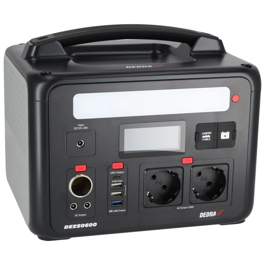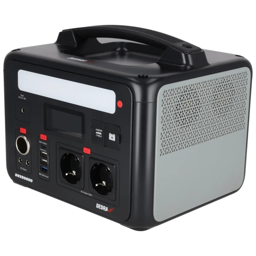 Kapacita 50Ah, 640Wh, LiFePO4, výstupný výkon AC 600W/1200W, vstavané zásuvky AC 2x230V/50Hz, DC 10-14, 4V/10A, USB 2.0x3, USB 3.0x1, USB Cx1, 12Vx1, zásuvka do auta, LED, LCD, funkcia štartovania motora 12V , sieťová nabíjačka, nabíjačka do auta, možnosť nabíjania solárneho panelu