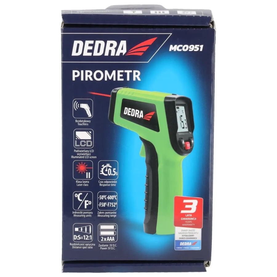 Rozsah merania teploty: -50 až +600 °C; vlnová dĺžka lasera: 635 nm; čas odozvy: 0,5 s; optické rozlíšenie (D:S): 12:1; spektrálna citlivosť: 8-14um; emisivita: 0,95 (konštantná); bezkontaktný; podsvietený LCD displej.