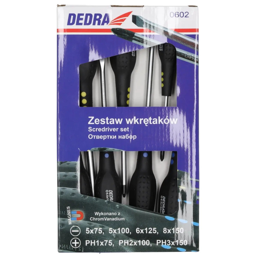 Materiál: CrV oceľ (gumová rukoväť); magnetické hroty; sada: SL5x75/SL5x100/SL6x125/SL8x150/PH1x75/PH2x100/PH3x150