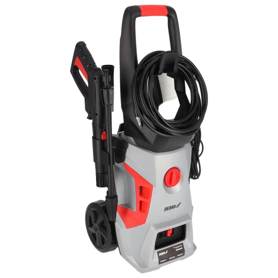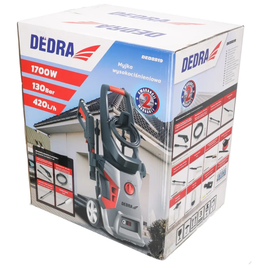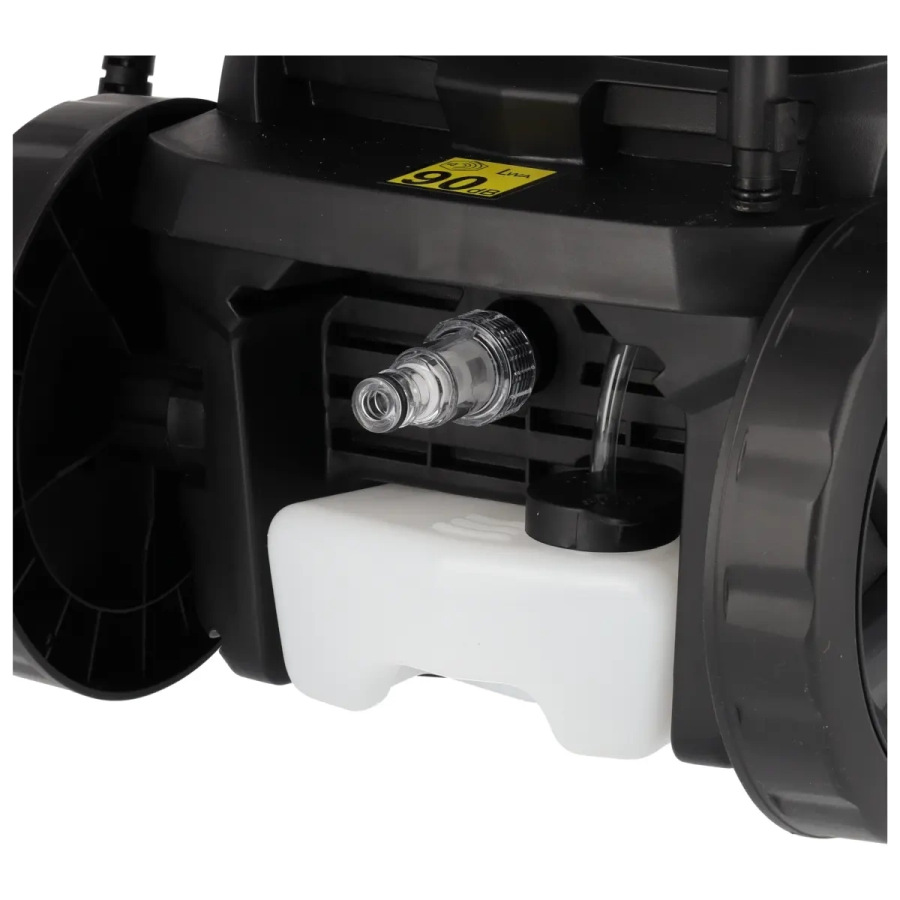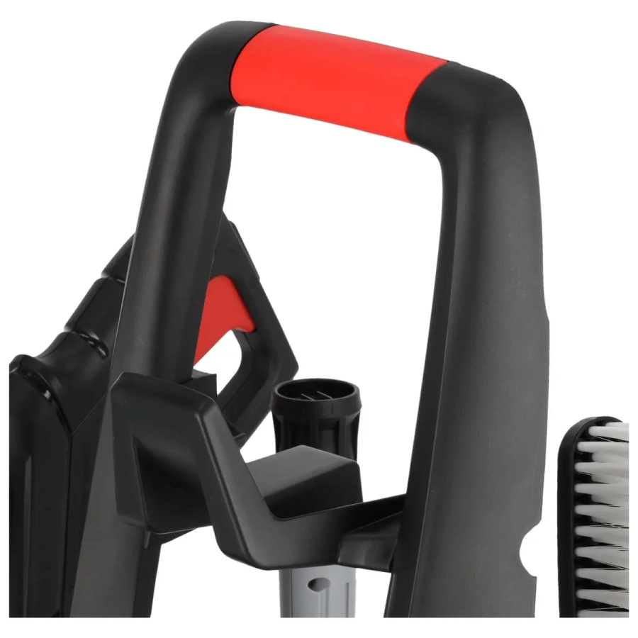 Hliníkové čerpadlo, motor s hliníkovým vinutím, tlak max. 130 Barov, výkon 420 l/h, dlhý napájací kábel 5 m s vodným filtrom, max. teplota vody 50° C, v súprave: striekacia pištoľ s oštepom s tryskou s nastaviteľnou šírkou prúdu vody, plochá kefa